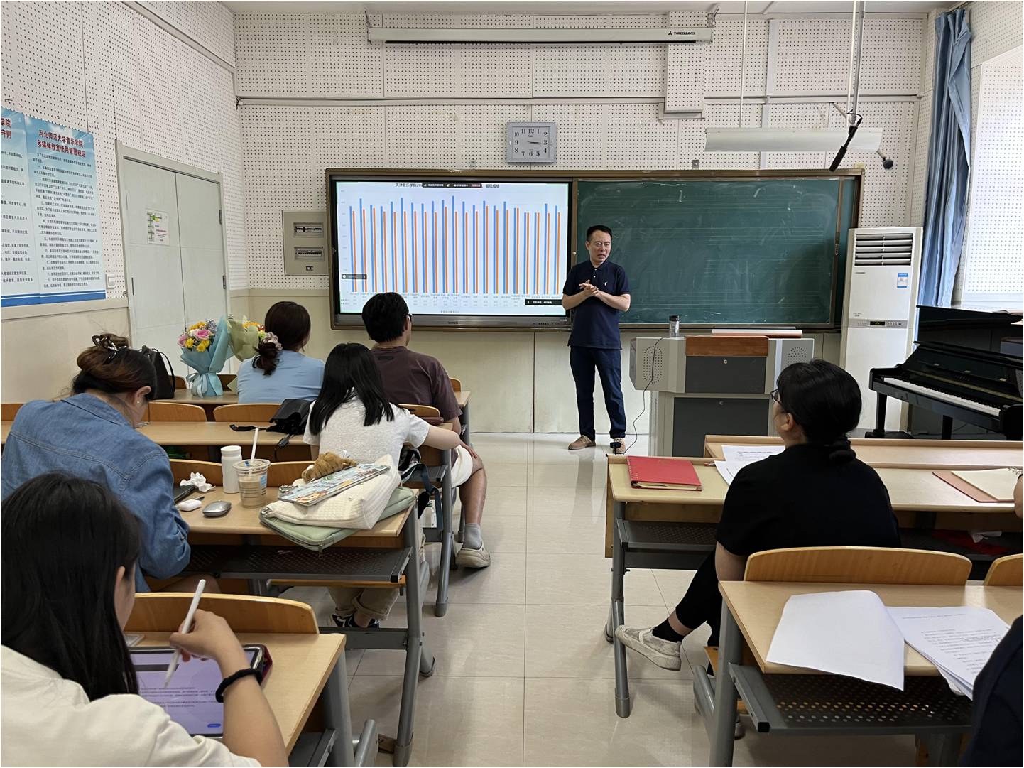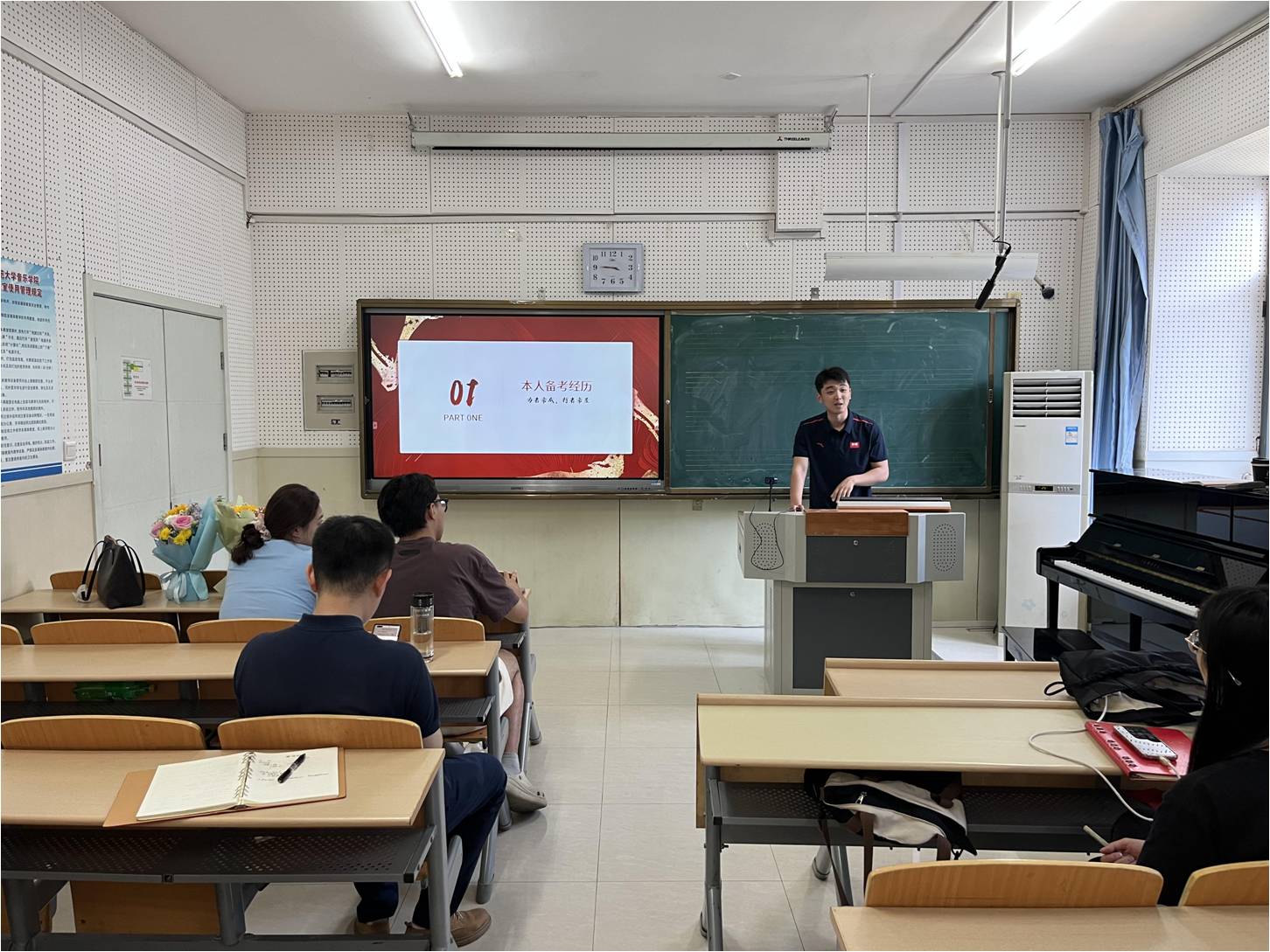 顺利考取唐山市曹妃甸区教师事业编的戚智超同学围绕唐山市教师编选聘面试经验进行分享,对招聘信息的获取、报名条件、考试流程以及选岗等问题作出详细解读,并结合自身所抽到的试讲试题进行考场备课示范讲解。他在讲解中指出,熟练掌握音乐教师的“三能八会”,练就过硬的专业本领,是我们能从“考编大军”中脱颖而出成功走上教师岗位所必备的条件。作为音乐学专业的同学,要从平时点滴入手,尽早通过教团队格证考试,并强化对自己的讲课和说课的打磨,