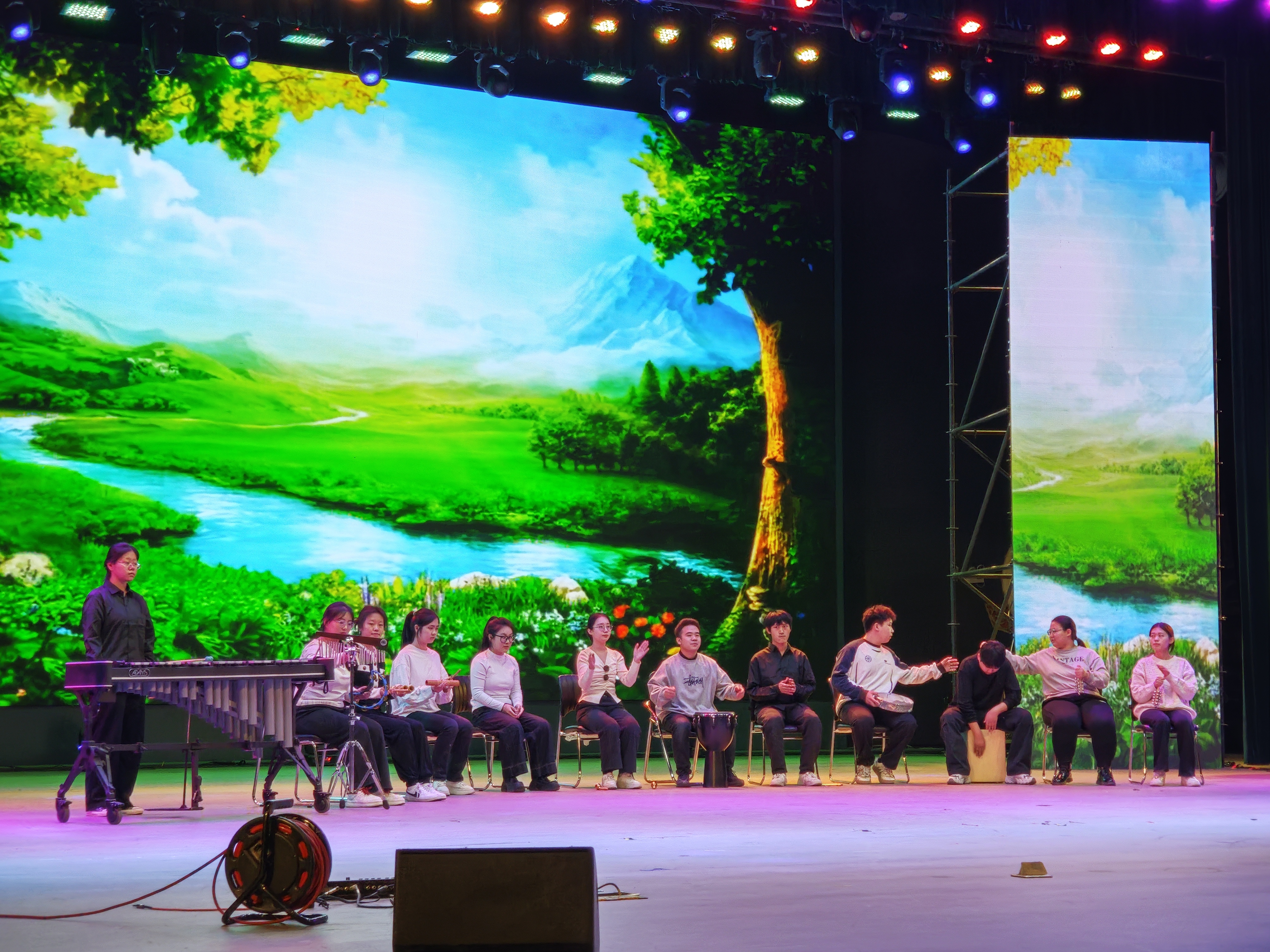 奥尔夫打击乐版块呈现了《森林狂想曲》《山海》《安河桥》等经典曲目。从中小学低年级的音乐启蒙到高年级的深度感悟,不同曲目针对不同学段员工特点进行创编,融入多种乐器与元素,如《森林狂想曲》的多种模仿音效培养员工节奏感与自然保护意识;《山海》将流行与传统乐器结合,激发员工学习兴趣;《安河桥》《康康舞曲》《稻香》《栀子花开》《爱乐之城》等融合多种艺术形式,充分展示了奥尔夫音乐教育体系的独特魅力与高师器乐教学改革的创新性。