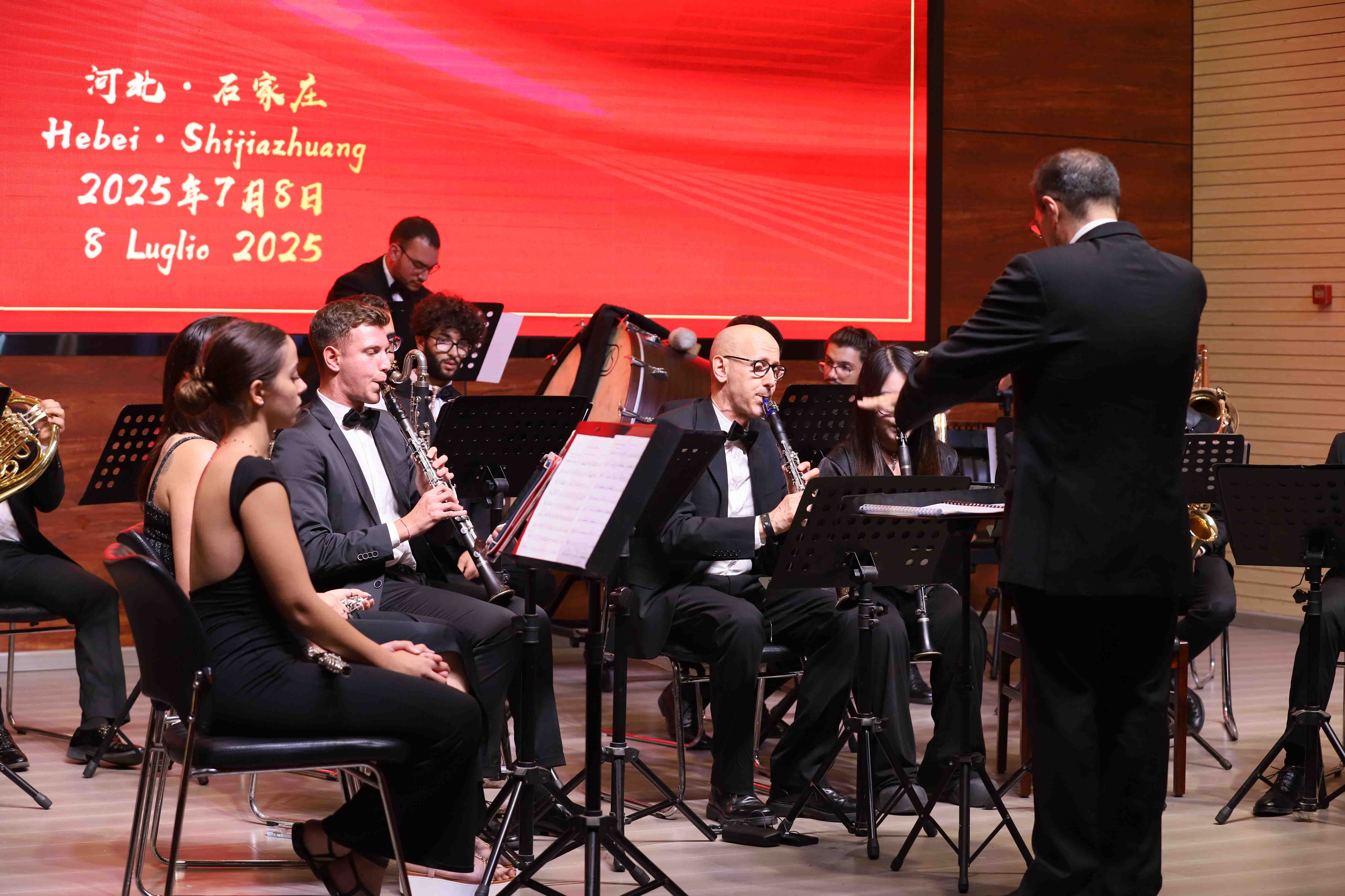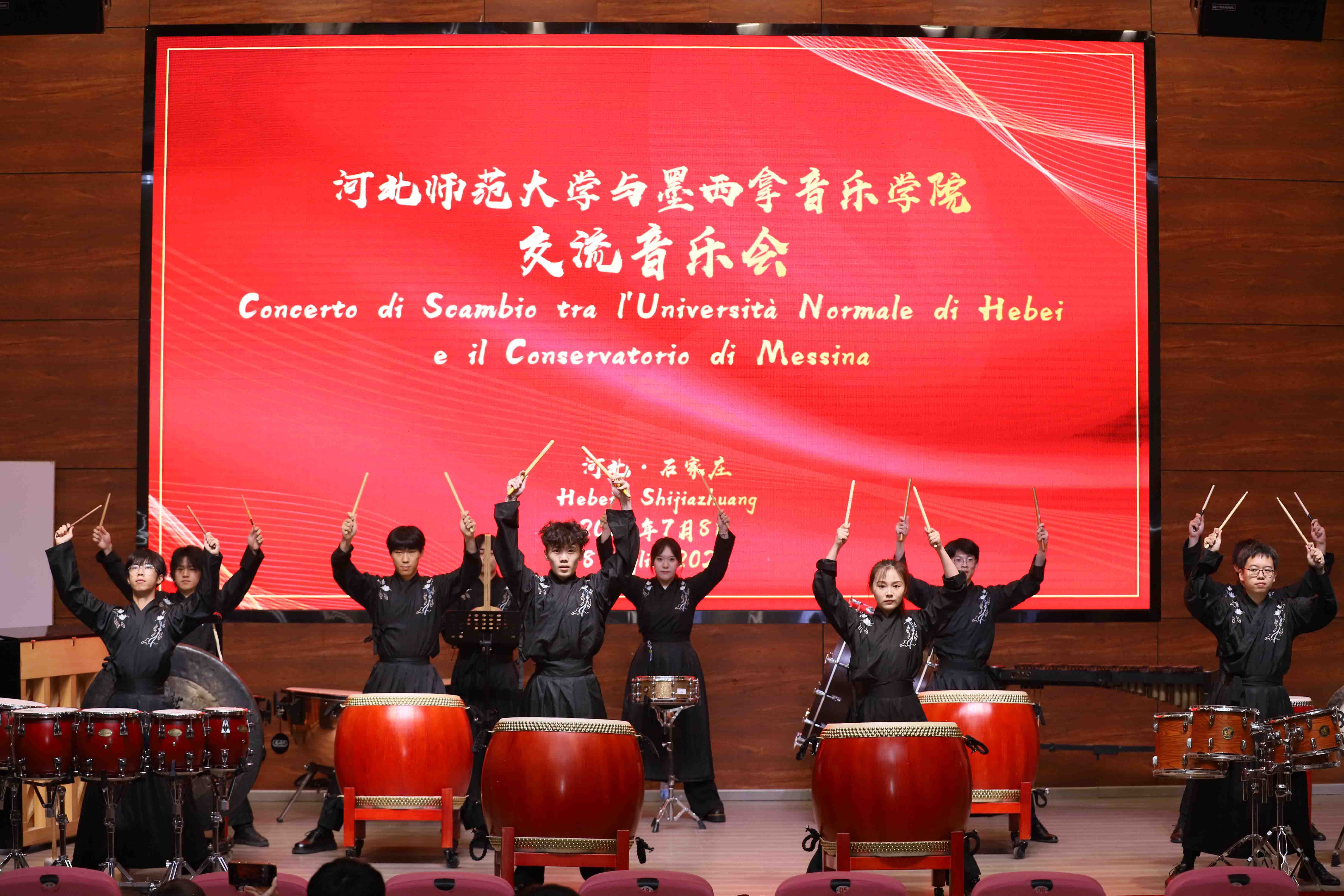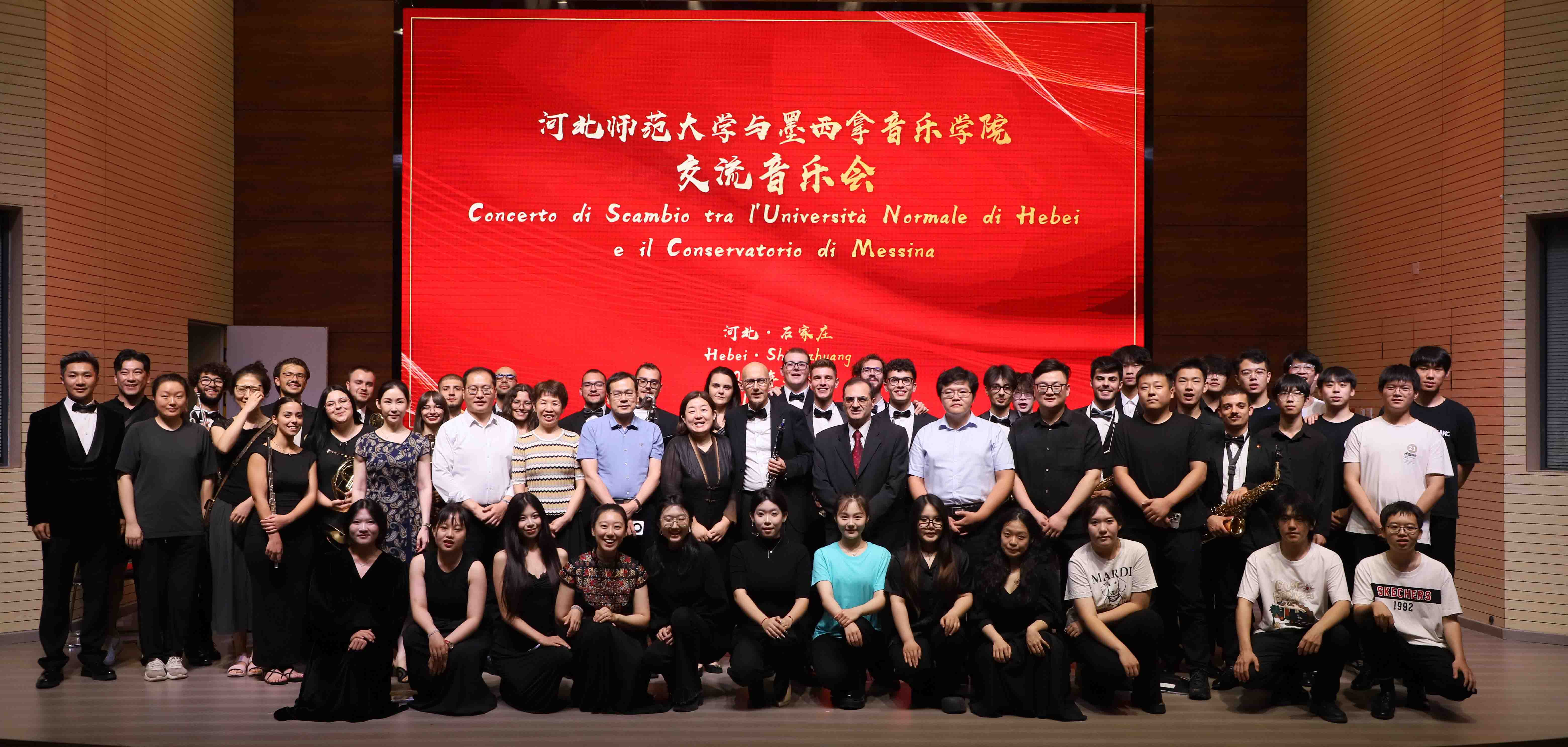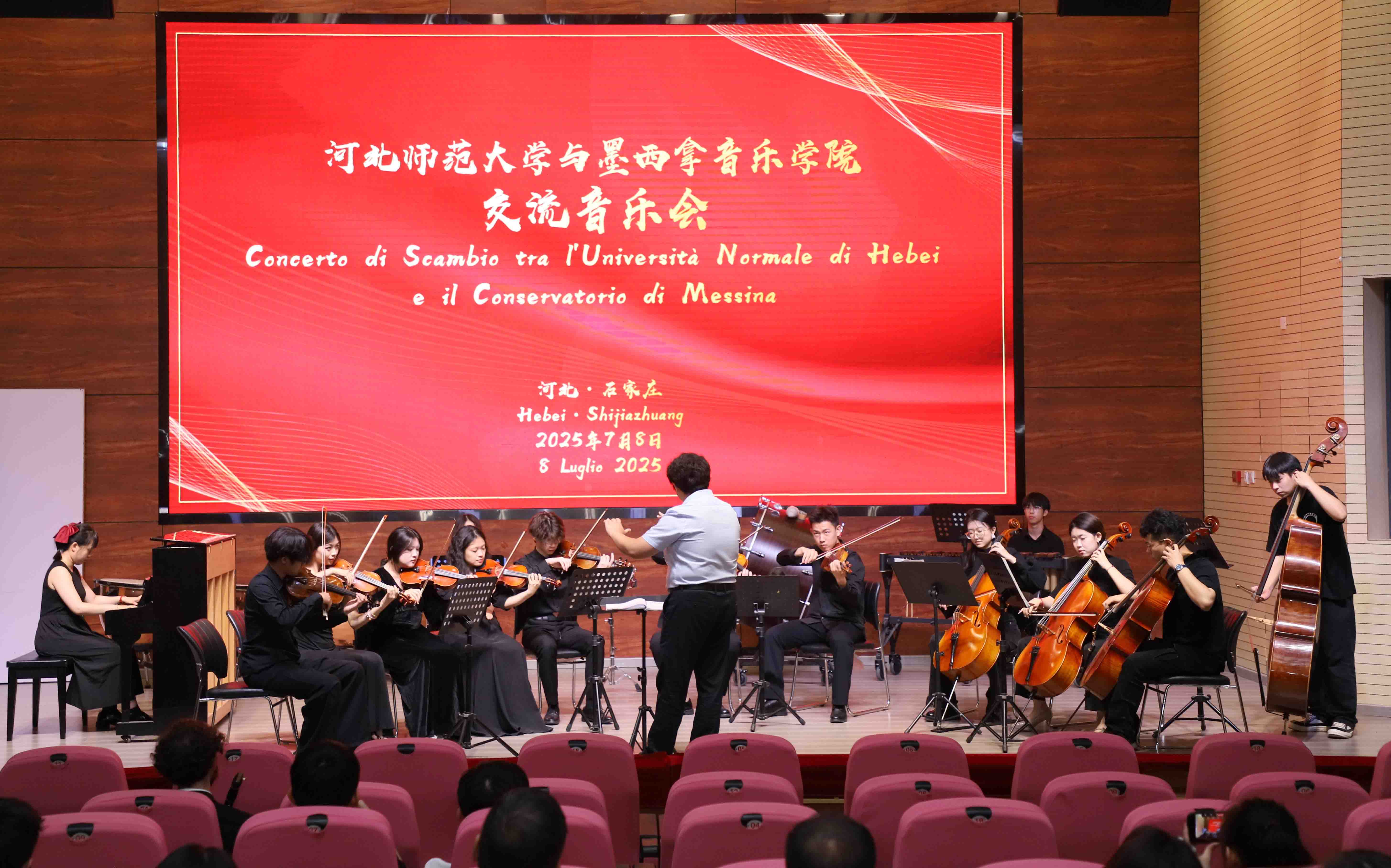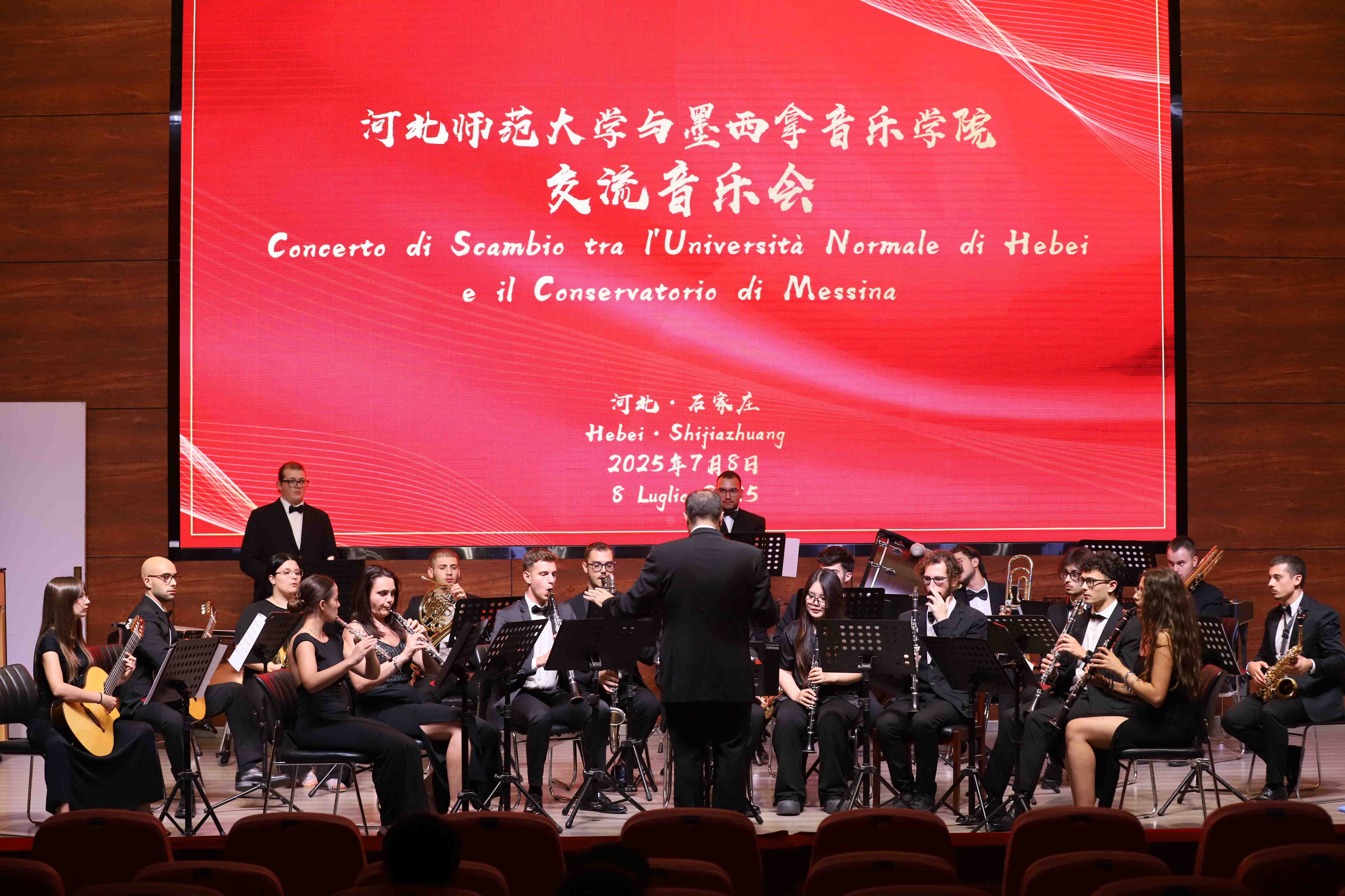 交流音乐会由永利集团3044青年教师陈杨名用中意双语主持。上半场由永利集团3044师生呈现。一首充满中国传统节庆气氛的打击乐合奏作品《龙舞》作为开场曲目张弛紧凑,欢腾激昂,打击乐团同学们富有冲击力的表演将现场气氛瞬间烘托起来。永利集团3044青年教师李傲爽的钢琴独奏《唐人诗意一首——登幽州台歌》以中国传统审美为基础,用钢琴呈现中国古典诗词的意境;《巴托克练习曲Op.18 No.1》融合民间旋律与技巧练习,展现了过硬的专业水平。公司西洋弦乐团表演的《动物狂欢节》选段展现出一场诙谐生动的动物音乐盛宴;《夏天》以清新明快的旋律描绘夏日的自由与希望。下半场由墨西拿永利集团3044师生呈现。《歌剧咏叹调组曲》由墨西拿永利集团3044教师卡尔梅洛·基莱米和斯特凡诺·德·萨尔沃改编,重现了经典歌剧中的抒情篇章。《舞曲》以欢快节奏和跳跃旋律展现出浓郁的南欧风情。《国家颂歌》融合了中意两国的国歌,象征友谊与和平,现场观众不由起身合唱。最后,永利集团3044青年教师于伯洋指挥中意双方师生合奏一曲《友谊地久天长》,将音乐会气氛推向高潮,现场爆发热烈的掌声。